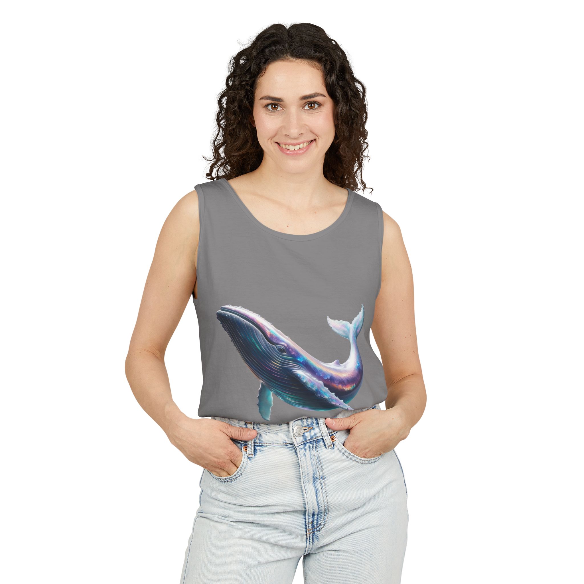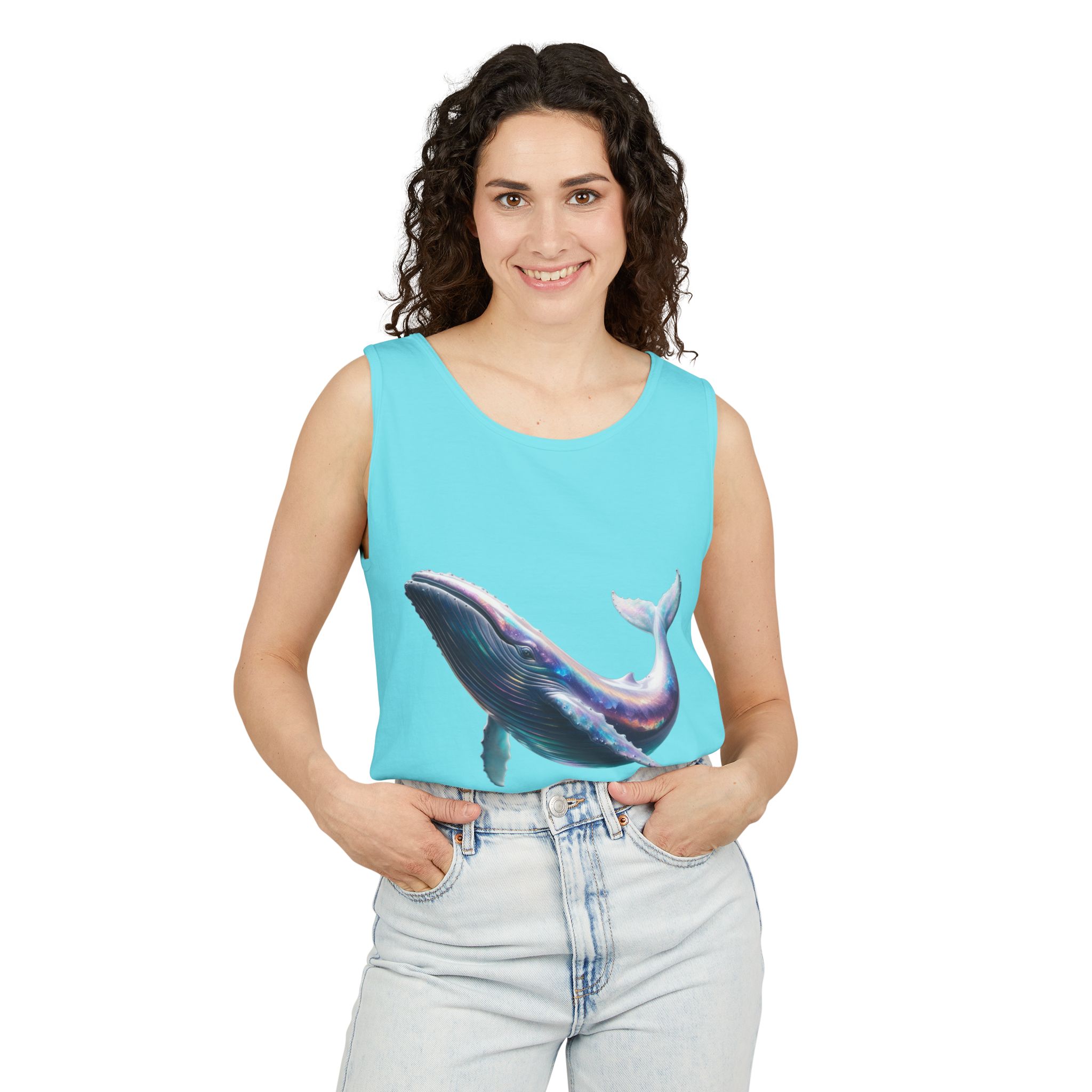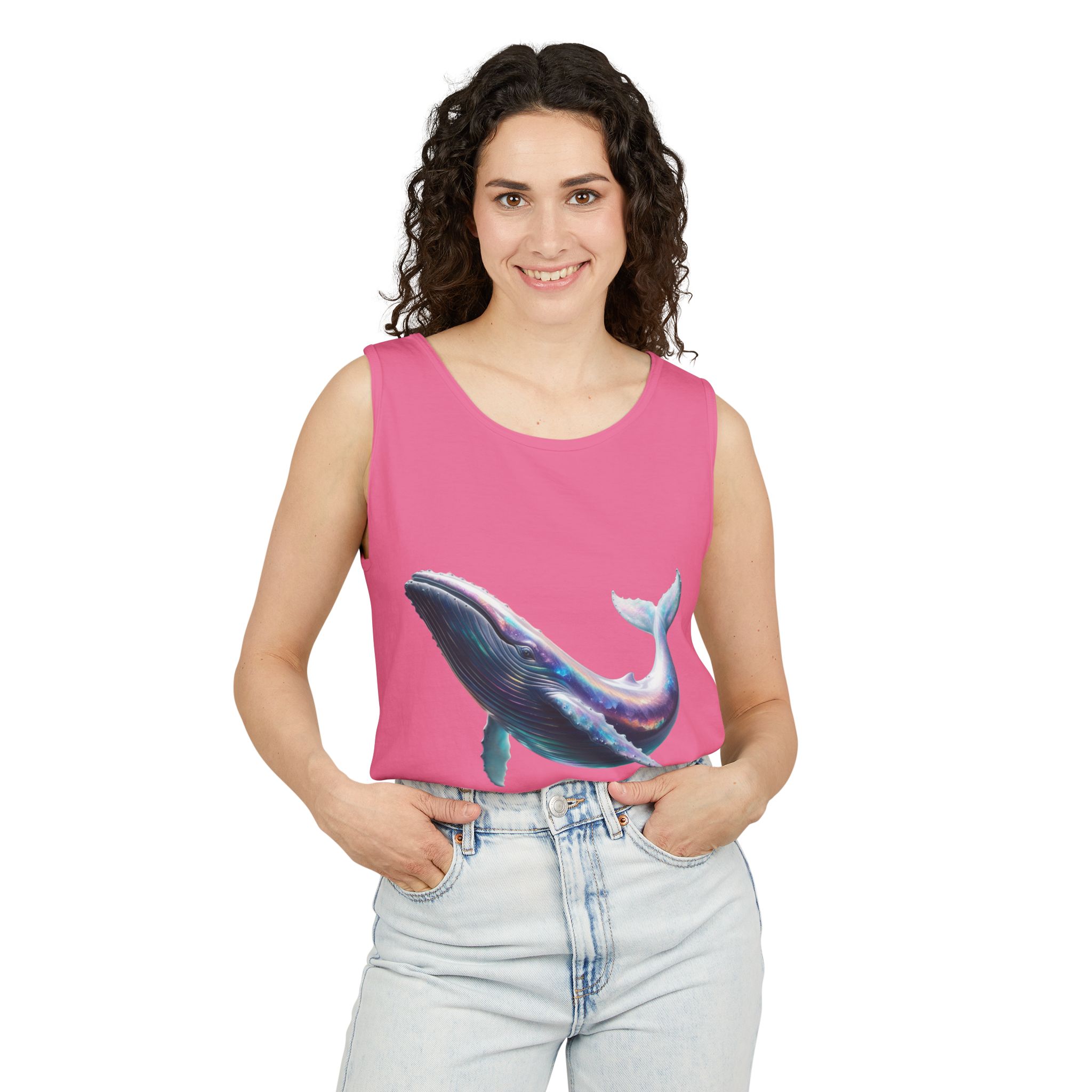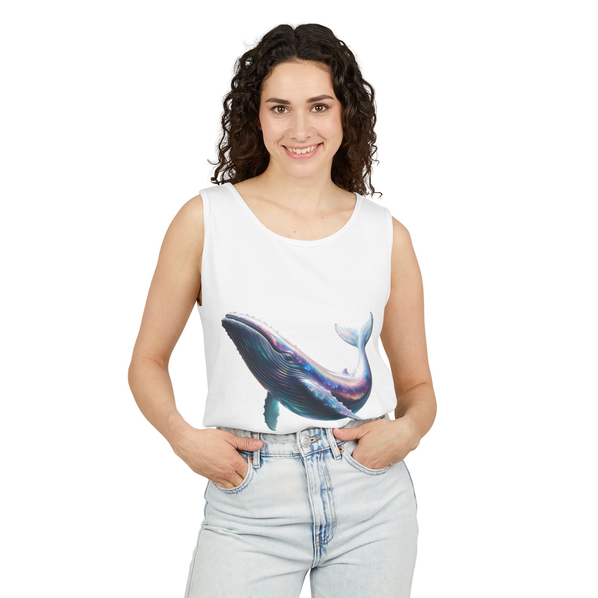 This tank top features a minimalist design with the phrase ‘ballena libre’. It exudes a laid-back and carefree vibe, perfect for casual wear during summer days or beach outings. It is relevant to individuals who appreciate simple and stylish apparel. This tank top is suitable for beach vacations, summer festivals, and casual outings.