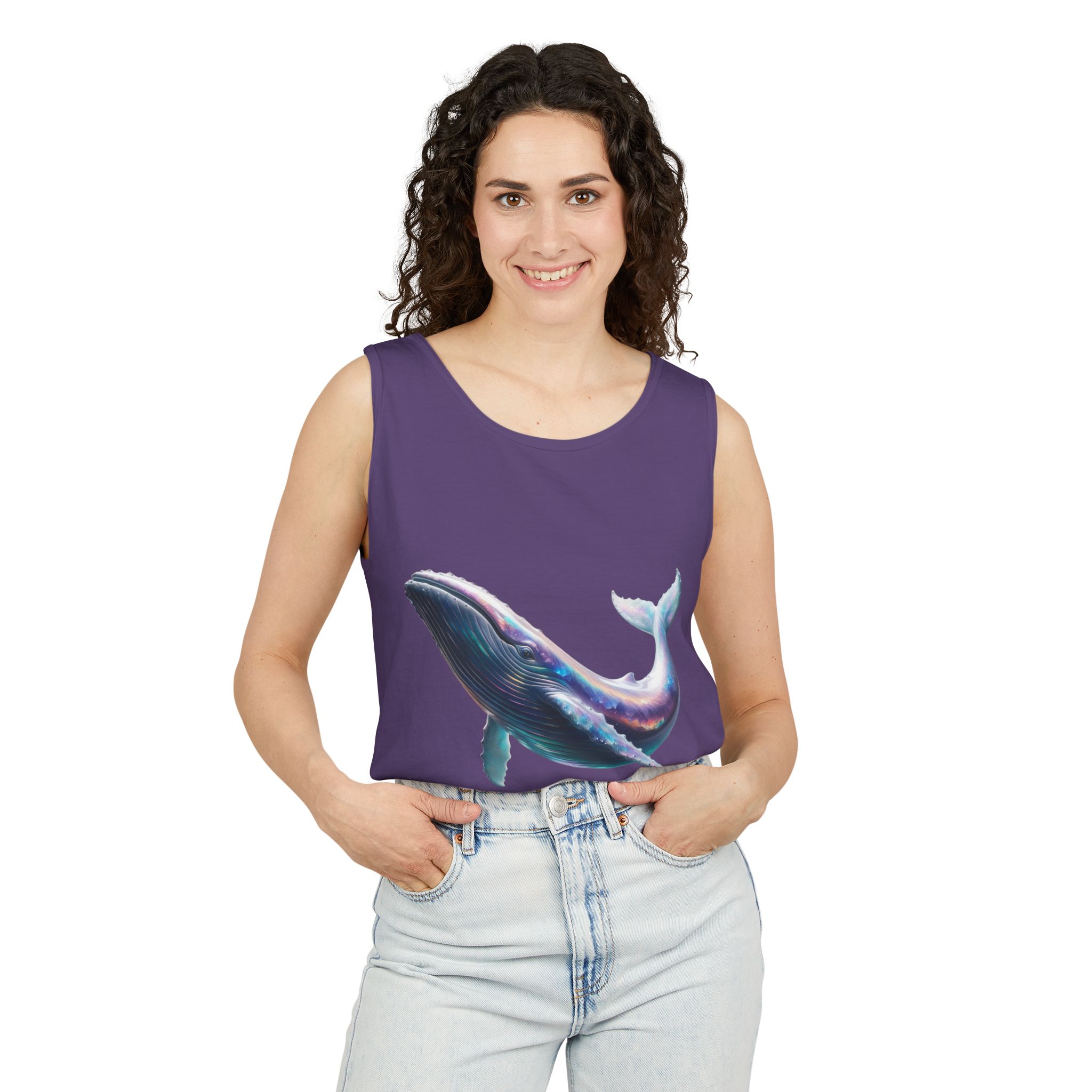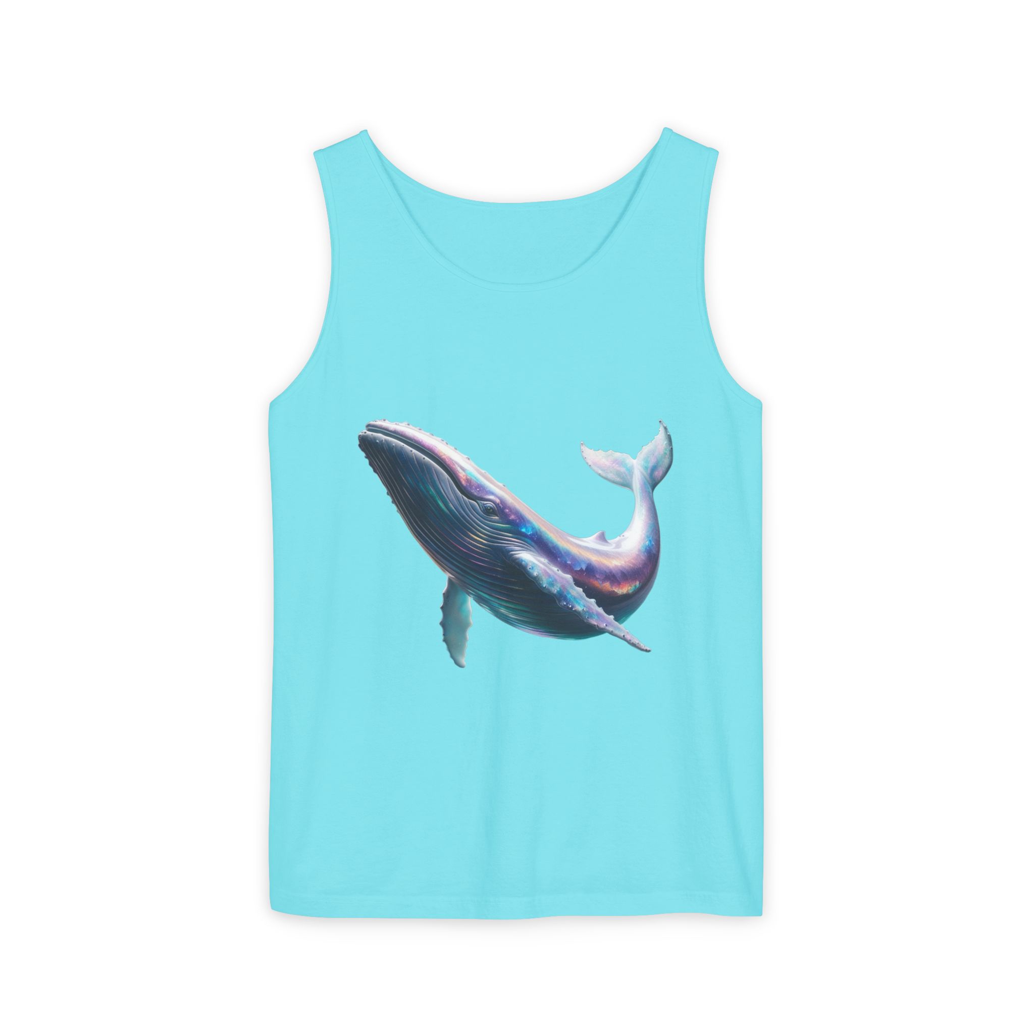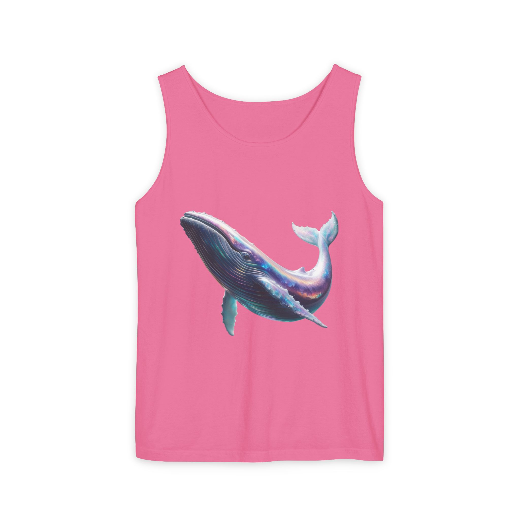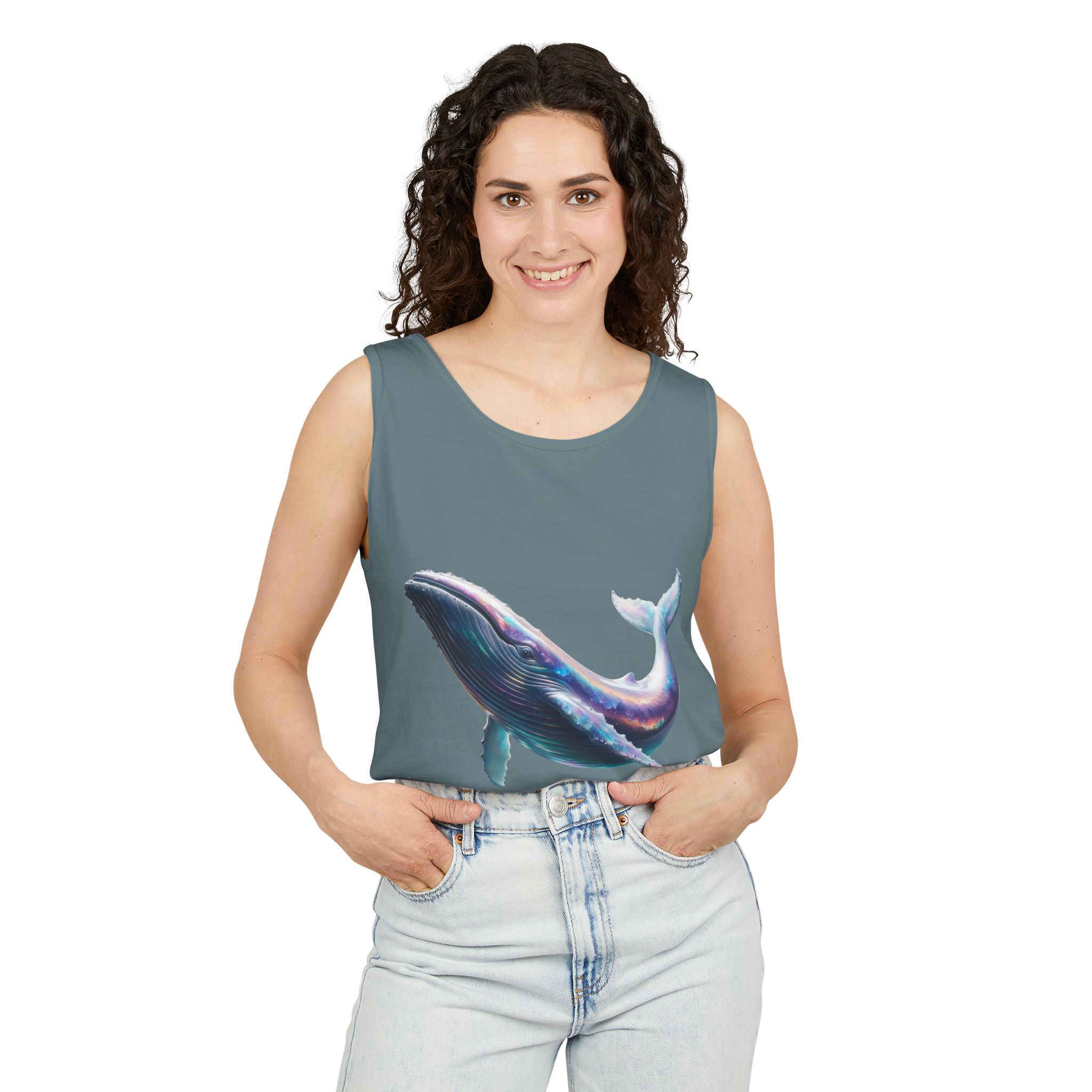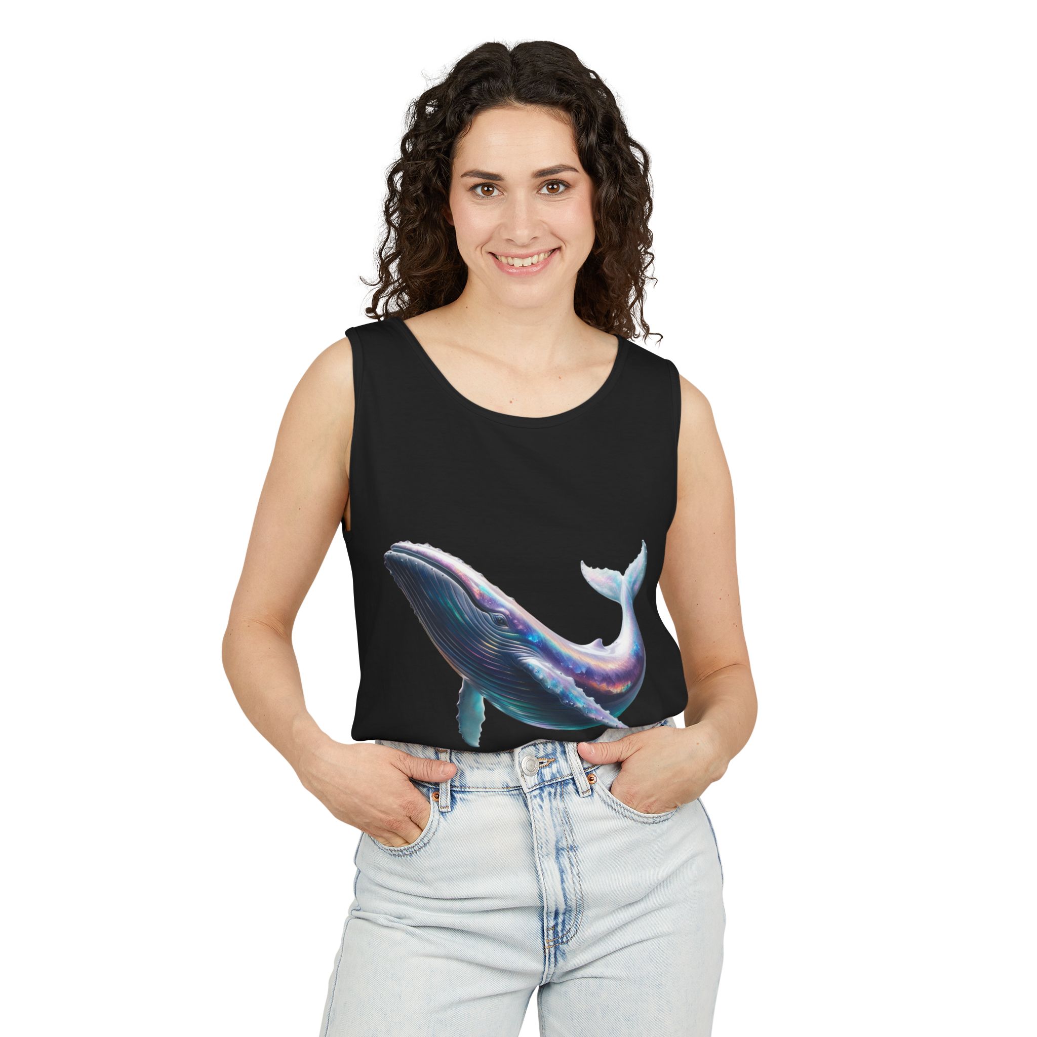 This tank top features a minimalist design with the phrase ‘ballena libre’. It exudes a laid-back and carefree vibe, perfect for casual wear during summer days or beach outings. It is relevant to individuals who appreciate simple and stylish apparel. This tank top is suitable for beach vacations, summer festivals, and casual outings.